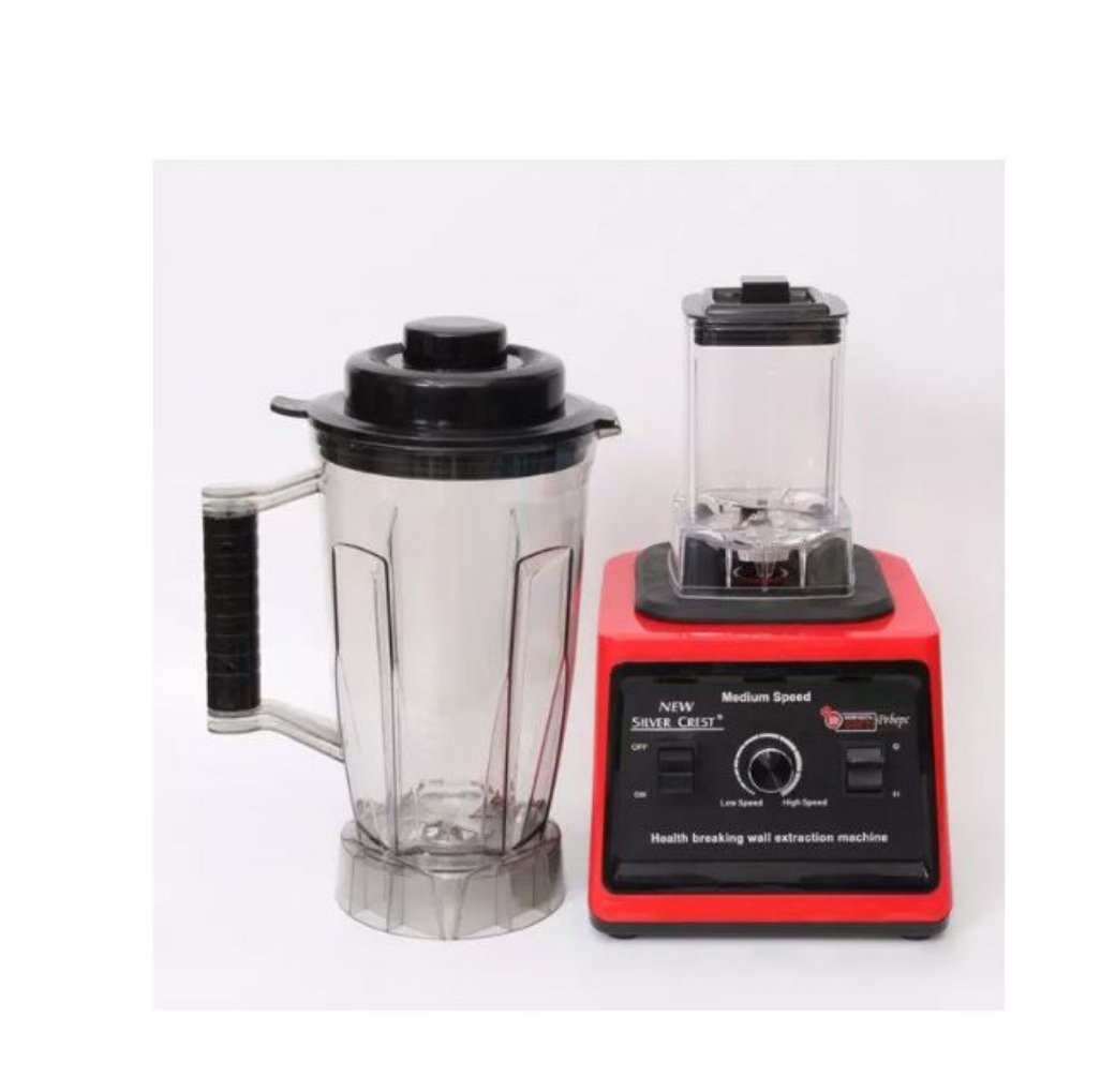9000w Silver Crest Blender, double polycarbonate cups, 32000RPM. It is stepless speed regulation and comes with stainless steel cutting blades, it crushes ice in seconds. It has a 3500ml capacity polycarbonate jar and it’s multifunctional, great for blending coffee beans and spices with another 1000ml polycarbonate jar. It’s comes with over current/temperature protection system and rated voltage of 220v~50Hz. Pure copper motor